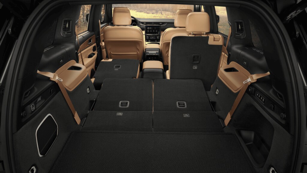 Cargo space management remains a strength of the 2025 Jeep® Grand Cherokee L platform. With all seats upright, the model offers 17.2 cubic feet of cargo capacity. Folding the third-row seats increases cargo space to 46.9 cubic feet, while folding both second and third rows expands the total available space to 84.6 cubic feet. The optional power-folding third row and hands-free power liftgate further simplify cargo handling for users managing multiple passengers and gear.
